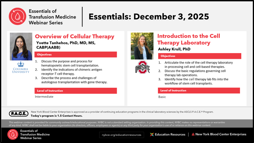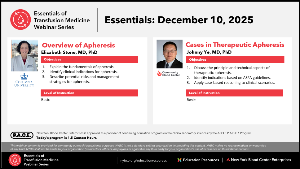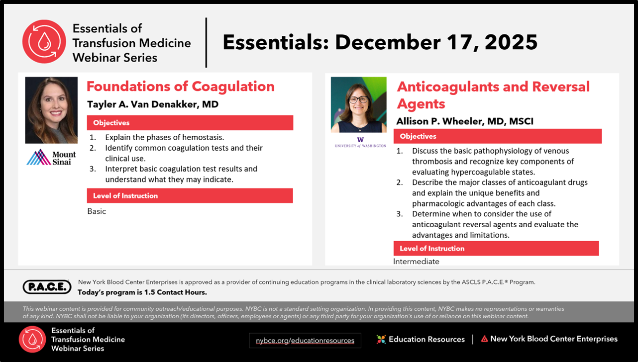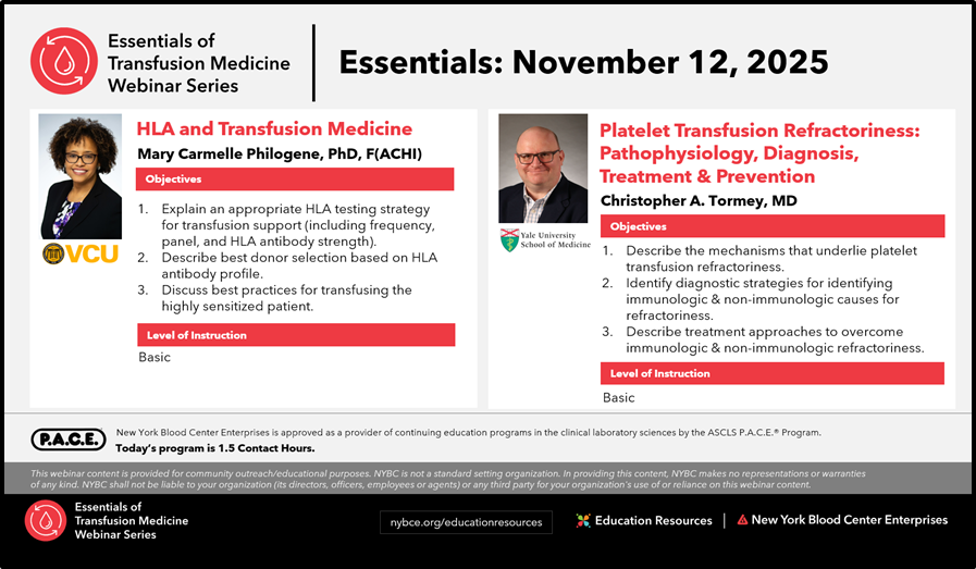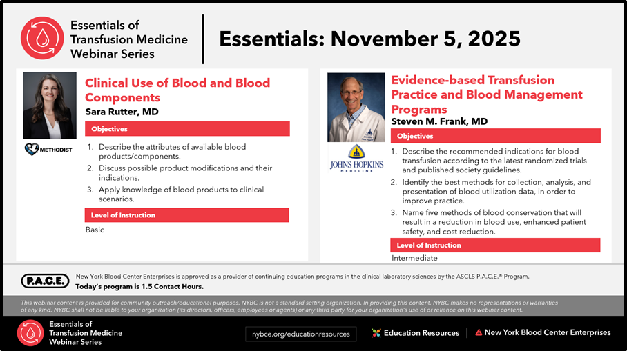 Recordings of all sessions in the Essentials of Transfusion Medicine Webinar Series will be available for viewing for a limited time. See below for all available programs.