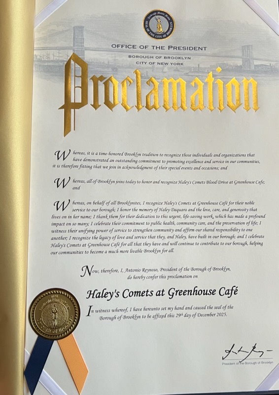To further honor the dedication of “Haley’s Comets at Greenhouse Café,” Brooklyn Borough President Antonio Reynoso bestowed a special Proclamation reserved for individuals and organizations that have demonstrated an outstanding commitment to promoting excellence and service in the Brooklyn community.